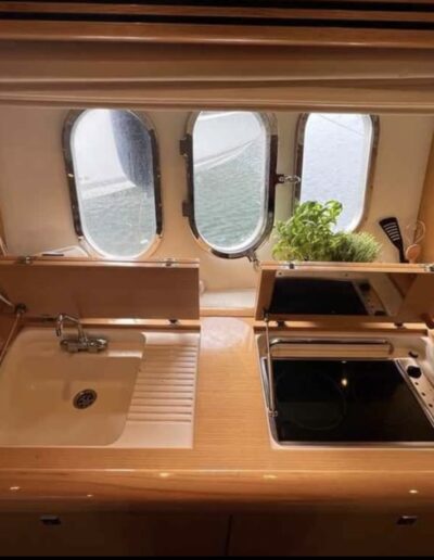 cucina attrezzata con lavabo, piastra a induzione 2 fuochi microonde e frigo all’americana 12v