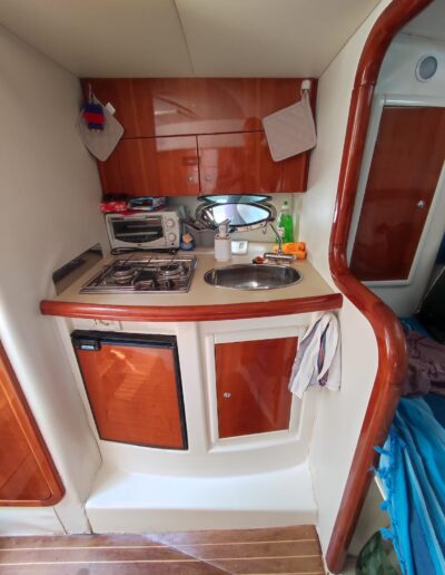 Cucina esterna, cuscineria completa, tavolo esterno trasformabile, plancetta in teak, tendalino, chiusura totale pozzetto, plancia di comando nuova,