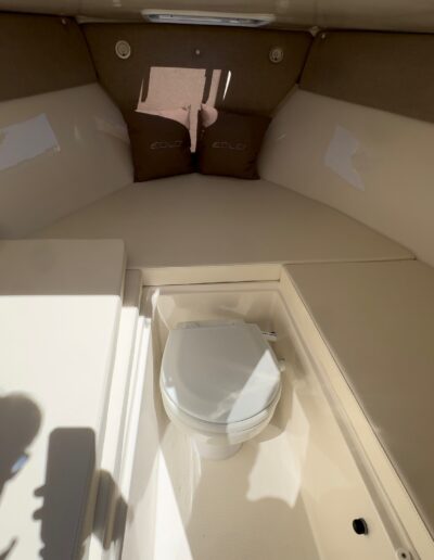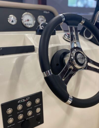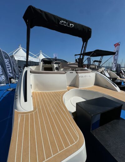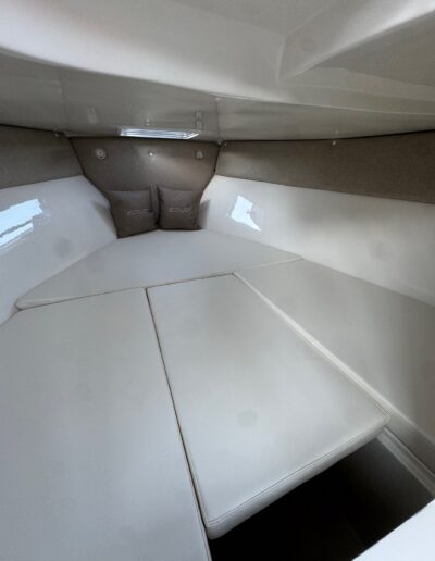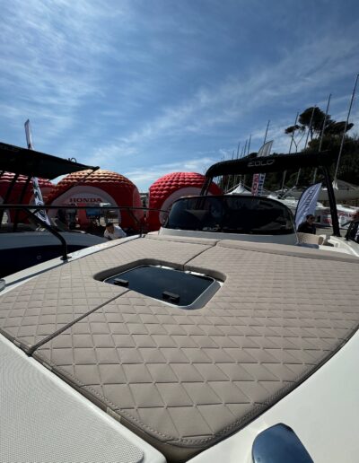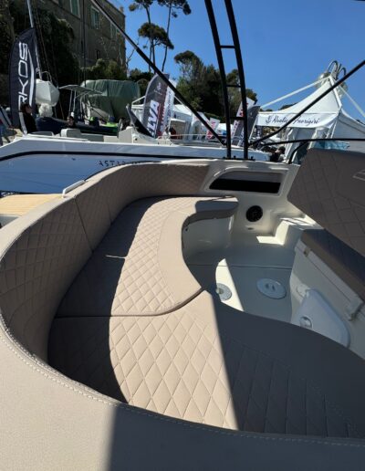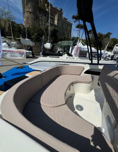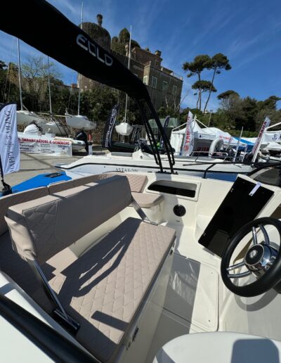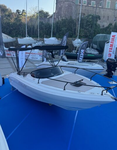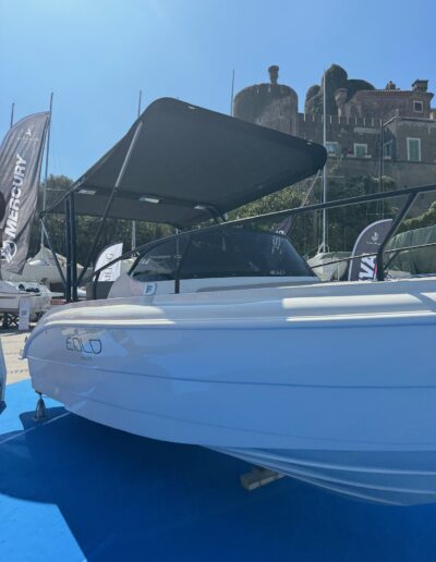 Tra gli accessori standard troviamo cuscineria completa, prendisole di prua e di poppa, scaletta bagno in acciaio inox, luci di via e impianto elettrico con bussola. La motorizzazione massima consigliata è di 150 hp.