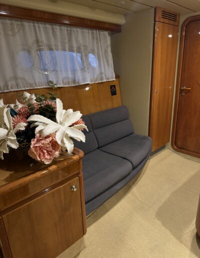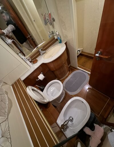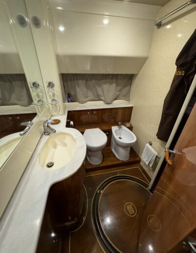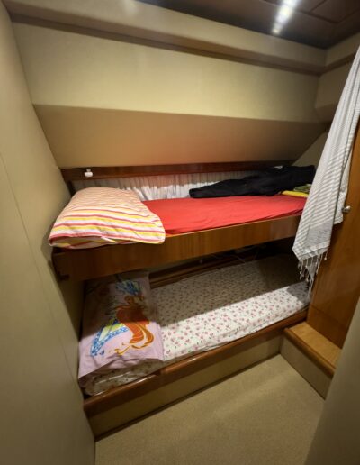 cabina armatoriale a centro barca con bagno privato, cabina Vip a prua con bagno privato, 1 cabina ospiti con due letti indiano, 1 cabina ospiti con letti a castello , un bagno per gli ospiti. cabina crew esterna con bagno privato.