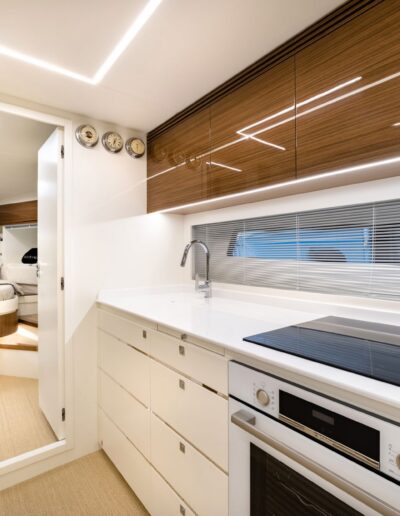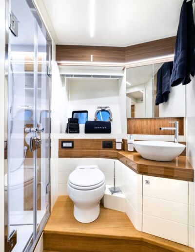 Molteplici alternative sottocoperta che saranno davvero a totale desiderio del cliente: soluzione a 3 cabine doppie oppure 2 cabine doppie e cabina singola, in entrambi i casi oltre la cabina marinaio.